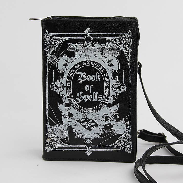 Introducing the Glow in the Dark Book of Spells Clutch Bag, a truly enchanting accessory that combines mystical allure with contemporary style. It adds a touch of magic and mystery to any outfit. Its unique glow-in-the-dark feature makes it a captivating conversation starter and a standout accessory that transcends ordinary fashion. Zippered main closure, fabric lined interior, dual compartments. Zippered middle compartment, includes a detachable 6in wristlet strap & a 24in adjustable and detachable shoulder strap. High quality vinyl material, measures approximately 6in length x 2.5in width x 9.5in height
