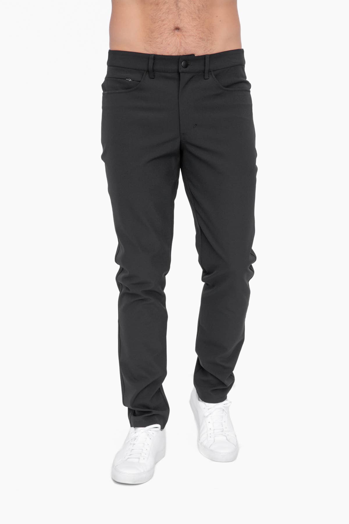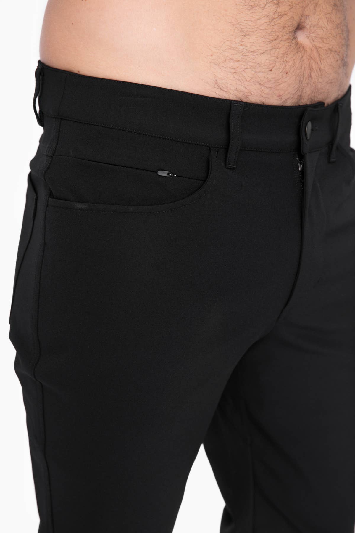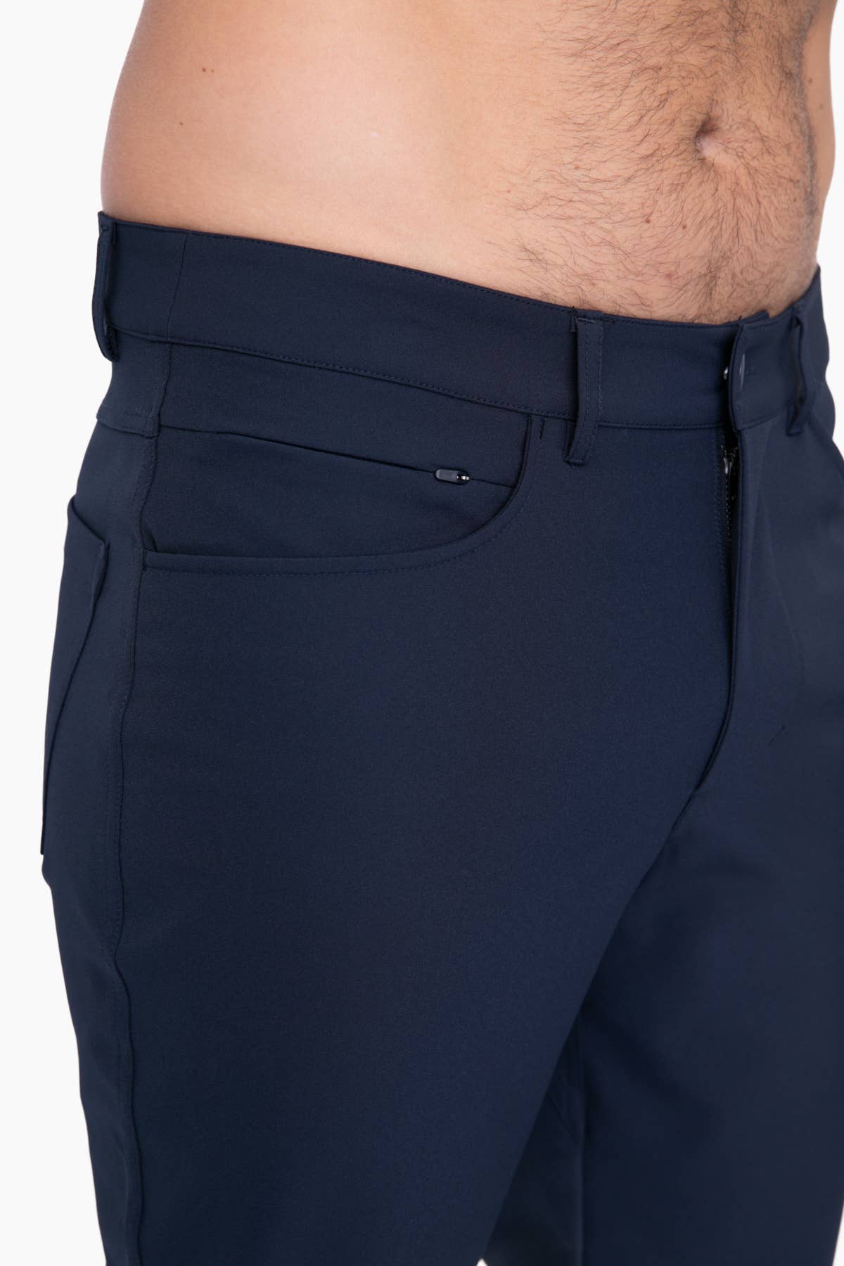 Take this classic style on and off the green! These 5 pocket pants are made in a stretch woven fabric and feature gussets for added mobility, an invisible zip pocket inside the wearers right hand pocket, and belt loops. The model is 6'1" and is wearing an M. 90% nylon 10% spandex 32" inseam.