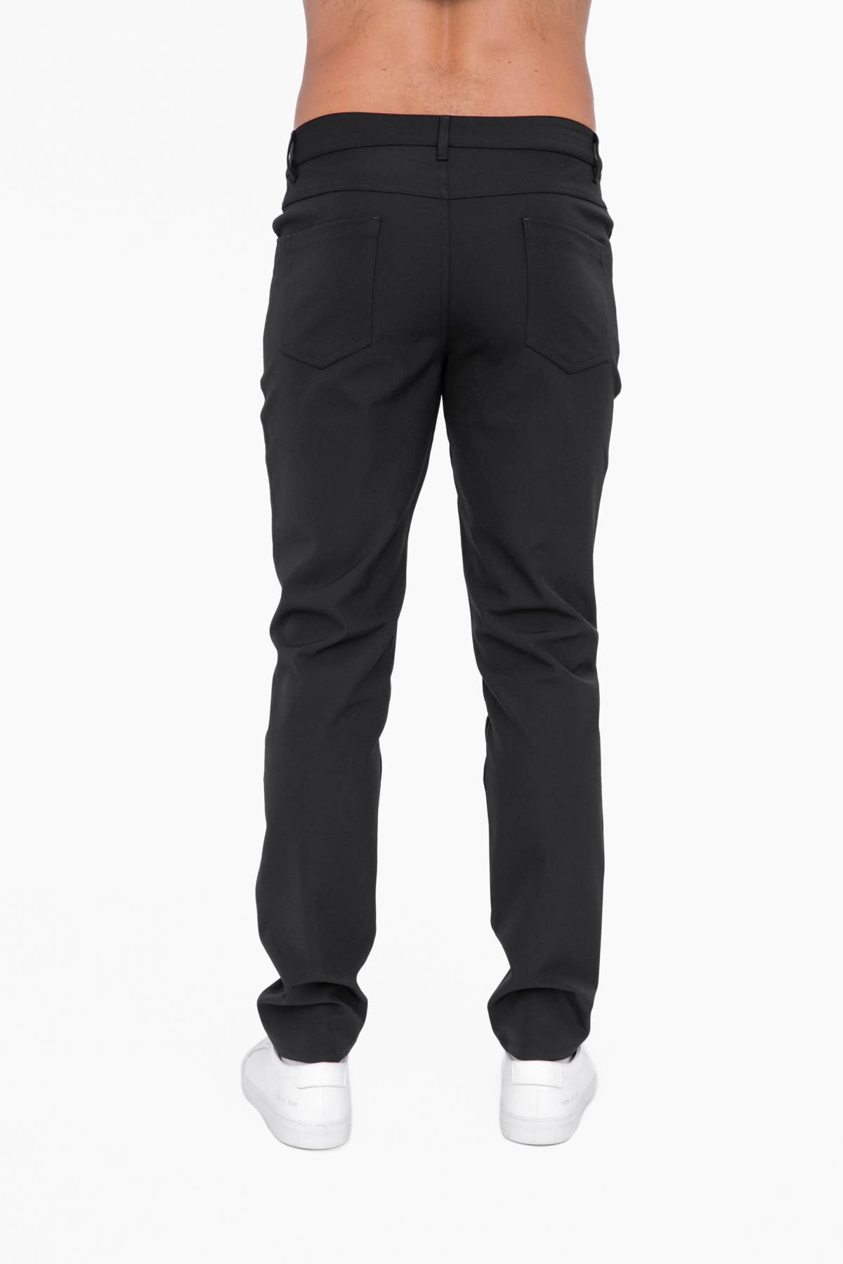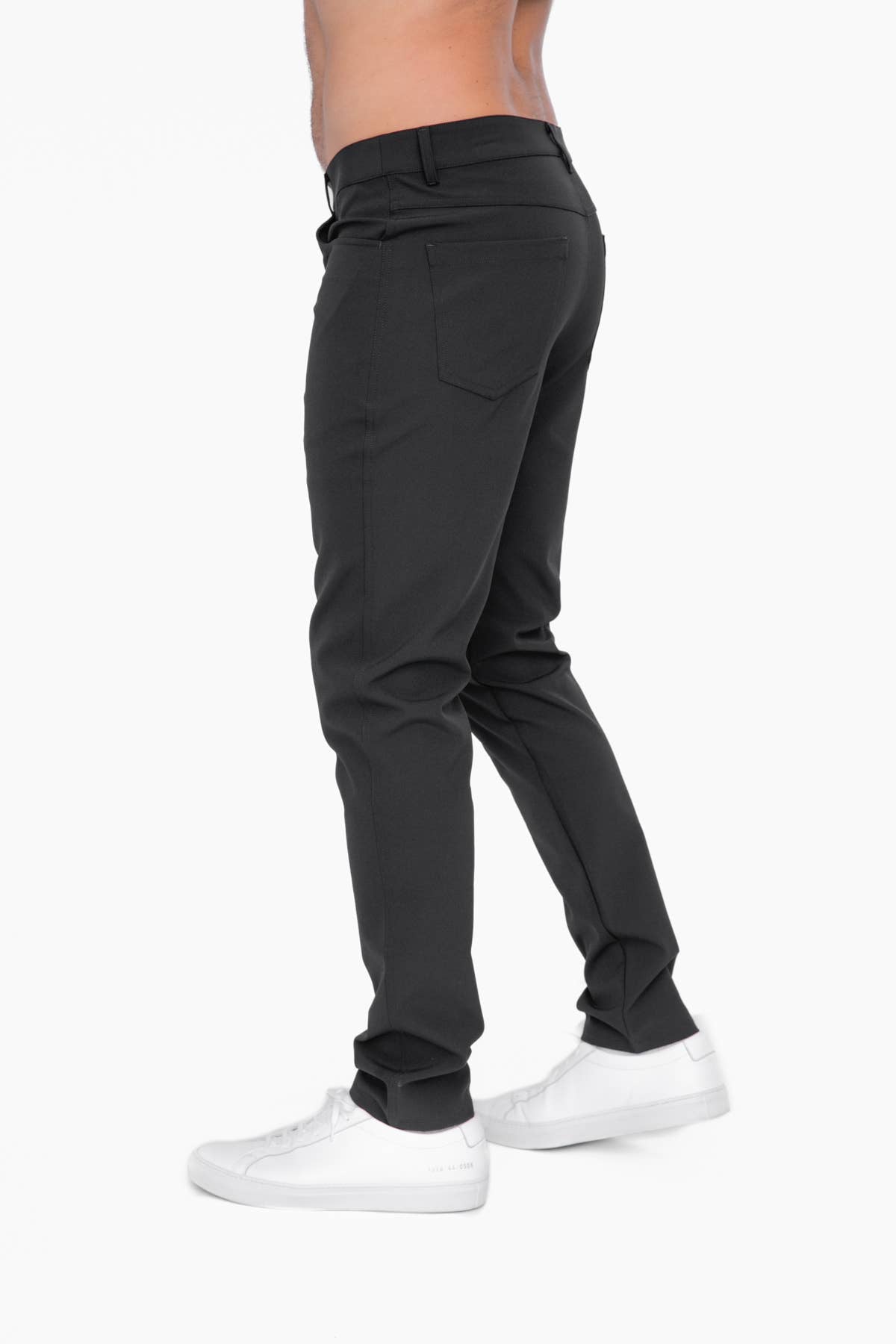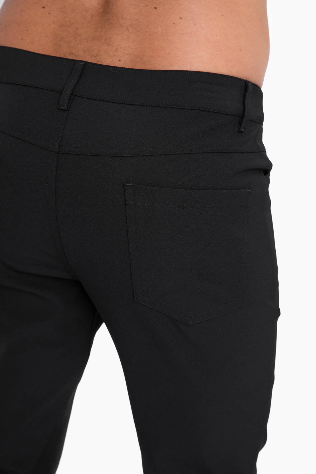 Take this classic style on and off the green! These 5 pocket pants are made in a stretch woven fabric and feature gussets for added mobility, an invisible zip pocket inside the wearers right hand pocket, and belt loops. The model is 6'1" and is wearing an M. 90% nylon 10% spandex 32" inseam.